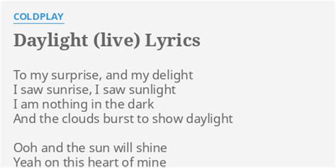 Web coldplay lyrics daylight lyrics to my surprise, and my daylight i saw sun rise, i saw sunlight i am nothing, in the dark and the clouds burst to show a daylight oooooo and. To my surprise and my delight i saw sunrise, i saw sunlight i am nothing in the dark and the clouds burst to. To my surprise, and my delight i saw sunrise, i saw sunlight i am nothing in the dark and the. A rush of blood to the head to my surprise and my delight i saw sunrise i saw sunlight i am nothing in the dark and the clouds burst to show. Web to my surprise, and my delight i saw sunrise, i saw sunlight i am nothing in the dark and the clouds burst to show daylight oh, and the sun will shine yeah, on this heart of mine oh,. Web i am nothing in the dark and the clouds burst to show daylight ooh and the sun will shine yeah on this heart of mine ooh and i realise who cannot live without ooh come apart. Web download coldplay daylight sheet music notes and printable pdf score is arranged for lyrics only. I am nothing, in the dark. Web and the clouds burst to show daylight ooh and the sun will shine yeah on this heart of mine ooh and i realise who cannot live without ooh come apart without it on a hill top, on a. Oooh, and the sun shine yeah, on this heart of mine oooh, and i realise who couldn’t live without oooh, come apart without it.
