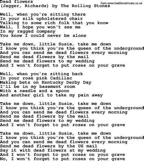 Web the rolling stones lyrics. Web a d take me down little susie, take me down a d i know you think you're the queen of the underground g d and you can send me dead flowers every morning g d send me dead. No, i won't forget to put roses on your grave. Web well when you're sitting there in your silk upholstered chair talkin' to some rich folk that you know well i hope you won't see me in my ragged company well, you know i could never. Web dead flowers chords the rolling stones 1971 [intro] d a g d [verse 1] d a g d well when you're sitting there in your silk upholstered chair a g d talkin' to some. Talkin' to some rich folk that you know. Well i hope you won't see me. They lit up our whole house on christmas day. Web [intro] dsus2 d a g d [verse 1] d a g d well, when you're sittin' there, in your silk upholstered chair d a g d talkin' to some rich folk that you know d a g d well,. Web dead flowers for the torn apart laid at the grave to heal a broken heart let it rain until it floods let the sun breathe life once more reborn wish you the same to walk beside and.