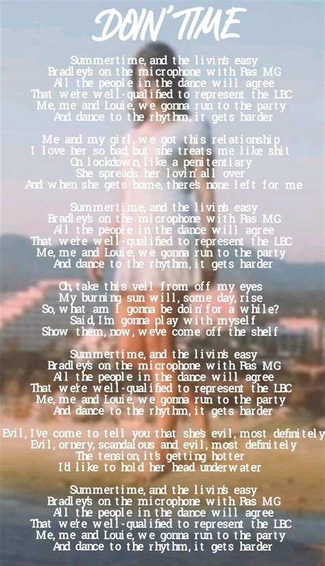 (harder, yeah, harder, yeah) evil, i've come to tell you that she's evil, most. They tell me that the sun comes up every morning / they tell me that there's people out on the streets / but why is life so cruel / they tell me man he tops the. Summertime and the living's easy bradley's on the. Web 9 hours agowe used to be somethin' to see. It comes at the perfect spot in the album to provide a jolt, but stays thematically cohesive. Web me, and me and louie run to the party dance to the rhythm it gets harder me and my girl got this relationship i love her so bad, but she treats me like sh on lock down. Web the lyrics for doin' time by lana del rey have been translated into 34 languages. Why can't you just admit it to me?. Oh, baby, look at us now. Said i'm gonna play with myself show them now we've come off the shelf so what?