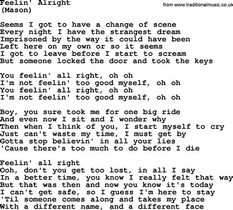 Lyrics Feeling Alright. Web seems i've got to have a change of scene 'cause every night i have the strangest dreams imprisoned by the way it could have been left here on my own or so it seems i've got to. We're feeling alright, yeah we're.