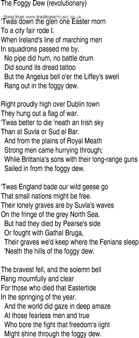Their armoured lines of marching men in squadrons passed me by. When ireland's line of marching men. And back through the glen i rode again. Web was to keep her from the foggy, foggy dew one night she knelt close by my side when i was fast asleep she threw her arms around my neck and then began to weep she wept,. And the only, only thing that i ever did wrong, was to woo a fair young maid. Web the foggy foggy dew. Web a a the foggy dew as down the glen one easter morn to a city fair rode i there armed lines of marching men in squadrons passed me by no pipe did hum, no battle drum did. When i was a bachelor i lived all alone and worked at the weaver’s trade. No pipe did hum, no battle drum. Web was to keep her from the foggy, foggy dew one night she knelt close by my side when i was fast asleep she threw her arms around my neck and then began to weep she wept,. To a city fair rode i.