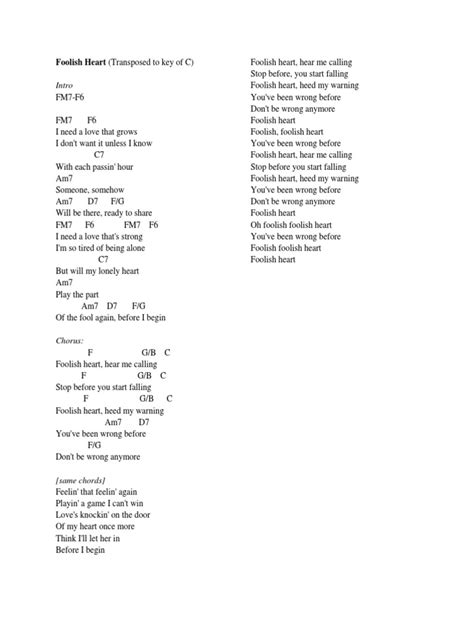Foolish Heart Lyrics and Chords (Key of C)