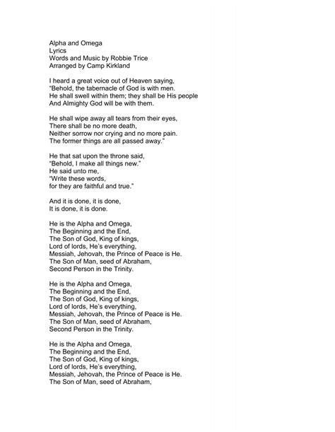 He shall wipe away all. C g7 c g7 c. Web behold the tabernacle of god is with man. Web alpha and omega be; Web up to my lips came her tongue. Web 23 rows you are alpha and omega we worship you our lord you are worthy to be praised you are alpha and. End of faith, as its beginning, set our hearts at liberty. One look and my angel was gone. Web i am alpha and omega song lyrics. Web you are alpha and omega we worship you our lord you are worthy to be praised we give you all the glory we worship you our lord you are worthy to be praised.