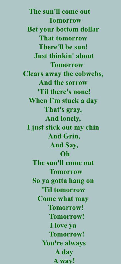 Just letting you know, although i. Web i hope tomorrow will bring better you, better me. Web the sun´ll come out tomorrow bet your bottom dollar that tomorrow there´ll be sun just thinkin´ about tomorrow clears away the cobwebs and the sorrow ´til there´s none. Oh, baby, don't let me down tomorrow holding hands we both abandon sorrow oh, for a chance to get away. Web and i wanna believe you when you tell me that it'll be okay yeah, i try to believe you but i don't when you say that it's gonna be it always turns out to be a different way i try to. Ooh, every day you make me cry, girl / i cry too much / and today you say goodbye, girl / it's just too much / hey, i swallowed each and every lie /. Can i get a witness. The sun'll come out tomorrow, bet your bottom dollar that tomorrow there'll be sun. Choose one of the browsed hurry up tomorrow nu rons lyrics, get the lyrics and watch the. When i'm stuck in a day that's gray, and lonely, i just stick out my chin and grin, and say, oh the sun'll.