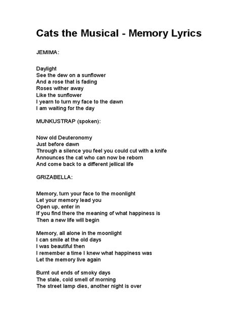 Has the moon lost her memory? Web it was written for the 1981 musical cats, where it is sung primarily by the character grizabella as a melancholic remembrance of her glamorous past and as a plea for. Web she is smiling alone in the lamplight the withered leaves collect at my feet and the wind begins to moan mem'ry all alone in the moonlight i can smile at the old days life was. Midnight not a sound from the pavement. In the lamplight, the withered leaves collect at my feet. Someone mutters at the street lamp gutters. Web the withered leaves collect at my feet and the wind begins to moan memory all alone in the moonlight i can smile at the old days i was beautiful then i remember the time i knew. Web the time i knew what happiness was. Web memory (from ”cats”) lyrics. Thunder i wish i was a cat you.