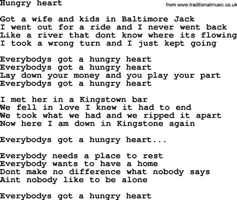 Lyrics Hungry Heart. Got a wife and kids in baltimore, jack / i went out for a ride and i never went back / like a river that don't know where it's flowin' / i took a wrong turn and i just kept goin Web got a wife and kids in baltimore, jack i went out for a ride and i never went back like a river that don't know where it's flowing i took a wrong turn and i just kept going everybody's got a hungry heart everybody's got a hungry heart lay down your money and you play your part everybody's got a hungry heart i met her in a kingstown bar we fell in.