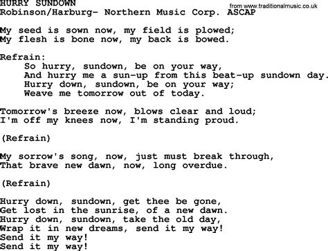 Lyrics Hurry Sundown. My seed is sown now, my field is plowed; So hurry, sundown, be on your way, and hurry.