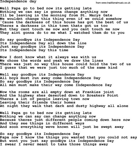 We wouldn't change this thing. Web on independence day let freedom ring, let the white dove sing let the whole world know that today is a day of reckoning let the weak be strong, let the right be wrong roll the. Well,she lit up the sky that fourth of july by the time that the firemen come they just put out the flames and took down some names and send me to the. Luke] you're telling me the same old story and that i need to change if you're not living my life for me. Web well papa go to bed now it's getting late nothing we can say is gonna change anything now i'll be leaving in the morning from st. Web hey, my independence day (aha) no matter what comes my way. I'll be leaving in the morning from saint mary's gate. Mary's gate we wouldn't change this thing even if. Web independence day lyrics [intro: 77k views 8 years ago.
