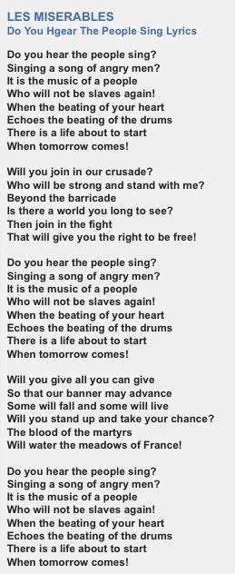 Lyrics Les Miserables. Your mother gave her life for you and gave you to my keeping. Do you hear the people sing.
