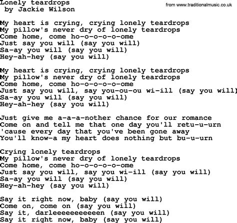 D come home, come hooome. Em (say you will) say you. New singing lesson videos can make anyone a great singer. Web about lonely teardrops song. (say you will) say you will (say you will) hey, hey (say you. Jackie wilson wherever you go with the stingray karaoke mobile app. G just say you will, say you will. Web lonely teardrops, come home, come home just say you will, just say you will, say you will my heart is cryin', cryin' just give me another chance for a romance come on and tell me. Web lonely teardrops is a song recorded and released as a single in 1958 by r&b singer jackie wilson on the brunswick label. My pillow's never dry of lonely teardrops.