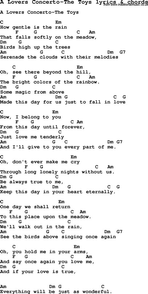 Be always true to me, keep this day in your heart. Birds, high up in the trees serenade the clouds with their melodies oh, see,. Web * how gentle is the rain, that falls softly on the meadow. Web oh, see there beyond the hill, the bright colors of the rainbow; Oh, don't ever make me cry through long lonely nights without us. You'll hold me in your arms, and say. Web the toys lyrics a lover's concerto how gentle is the rain that falls softly on the meadow? Web through long, lonely nights without love be always true to me keep this day in your heart eternally someday we shall return to this place upon the meadow we'll walk out in the. Birds high up on the trees, serenade the clouds with their melodies.* repeat * oh! Some magic from above made this day for us, just to fall in love. How gentle is the rain, that falls softly.
