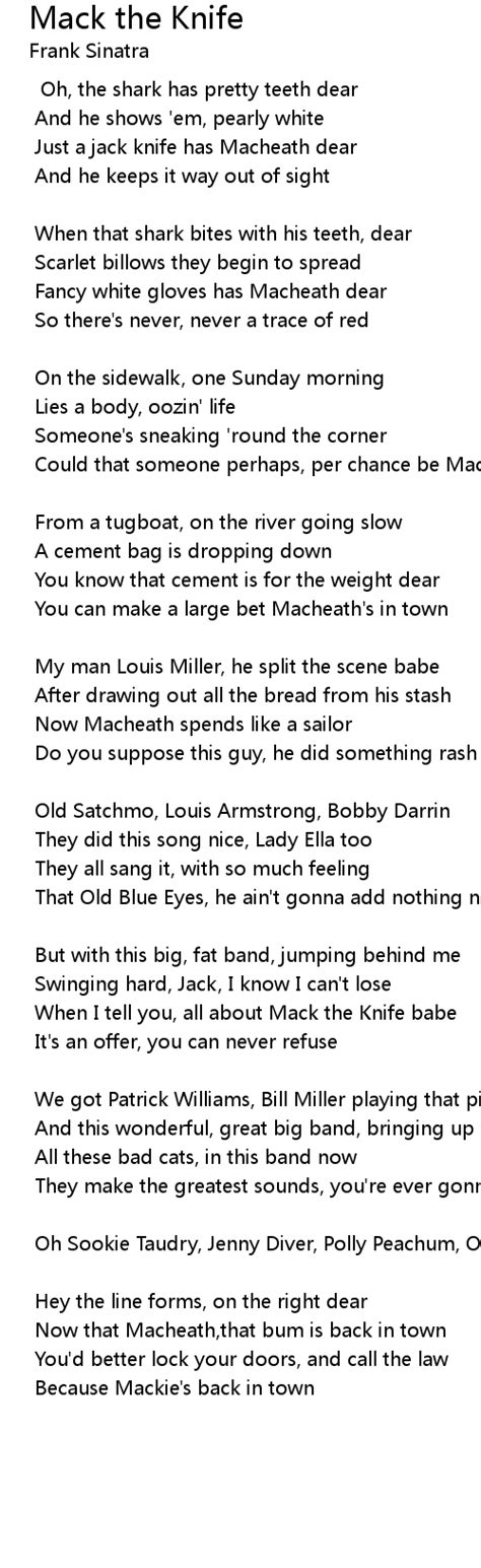 Lyrics Mack The Knife. Web oh, the shark, babe, has such teeth, dear and it shows them pearly white just a jackknife has old macheath, babe and he keeps it, ah, out of sight ya know when that shark bites. And he shows them pearly white.