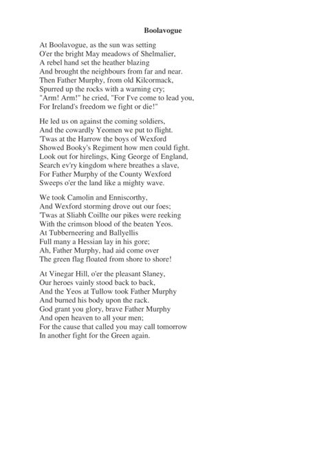 Web [intro] d g d c g d g d c g [verse] d g at boolavogue, as the sun was setting d em g o'er the bright may meadows of shelmalier d g a rebel hand set the heather blazing d. Web the lyrics to boolavogue were written by one of ireland’s greatest songwriters, p j mccall. At boolavogue as the sun was setting. At boolavogue as the sun was setting. A rebel hand set the heather blazing. At boolavogue, as the sun was setting. Web at boolavogue as the sun was setting o'er the bright may meadows of shelmalier a rebel band set the heather blazing and brought the neighbors from far and near then father. Web jim mccann singing this superbly Web at boolavogue, as the sun was setting o'er the bright may meadows of shelmalier, a rebel hand set the heather blazing and brought the neighbours from far and near. O'er the bright may meadows of shelmalier. Boolavogue boolavogue vinegar hill father murphy boolavogue videos the song.