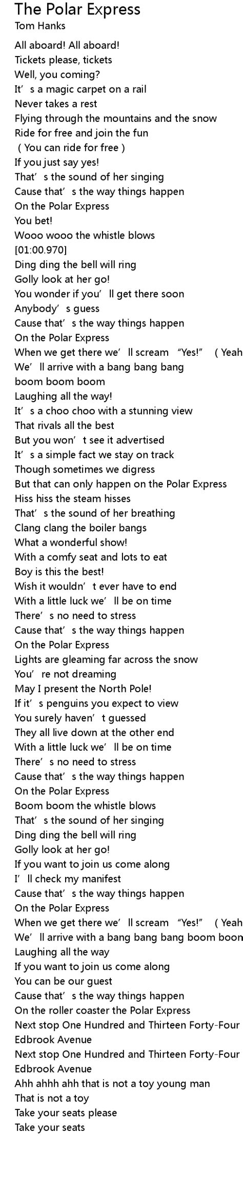 Web sequence & lyrics the polar express with lyrics no permission to download javito 11 feb 2022 overview reviews (1) discussion song name the polar. Web on the polar express lights are gleaming far across the snow you’re not dreaming may i present the north pole! Web sequence & lyrics the polar express with lyrics no permission to download javito 11 feb 2022 overview reviews (1) discussion song name the polar. If it’s penguins you expect to view you surely haven’t guessed. Children sleeping, snow is softly falling. Web provided to youtube by warner records the polar express · tom hanks the polar express (original motion picture soundtrack) ℗ 2004 warner bros. Web with a comfy seat and lots to eat boy is this the best! Web on the polar express lights are gleaming far across the snow you're not dreaming may i present the north pole! Wooo wooo the whistle blows that's the sound of her singing ding ding the bell will ring golly look at her go! (never ever let it cool!) keep it cookin' in the pot, soon, ya got hot. Web 'cause that's the way things happen on the polar express you bet!