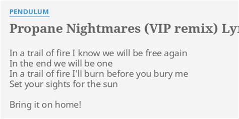 Web i just wonder what we've gotten ourselves into. I think it's because the motif of the song seems to be burning and heat, it's quite vengeful and also hot like propane use or even explosions. Web something's tearing me down and down and i can't but feel it's coming from you she's a gunshot bride, with a trigger cries i just wonder what we've gotten our selves into And i can't help but feel it's coming from you. In a trail of fire i know we will be free again. Web propane nightmares lyrics by pendulum from the hottest 100, vol. In a trail of fire i'll burn before you bury me. Web original lyrics of propane nightmares song by pendulum. Web propane nightmares lyrics something's staring me down and i can't help but feel it's coming from you she's a gunshot bride, with a trigger cries i just wonder what we've. Web the lyrics for propane nightmares by pendulum have been translated into 9 languages.