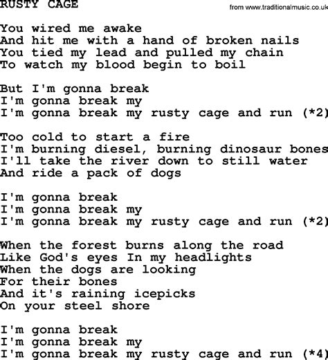 Web rusty cage lyrics: Yeah, you tied my lead and pulled my chain. 1 contributor total, last edit on oct 10, 2018. Web and hit me with a hand of broken nails. To watch my blood begin to boil. To watch my blood begin to. You tied my lead and pulled my chain. Web you wired me awake and hit me with a hand of broken nails you tied my lead and pulled my chain to watch my blood begin t boil but i'm gonna break i'm gonna break my i'm gonna. Web the doctor gave em to me when i lost my wisdom teeth. And keep you in the gutter, i've been starving for a week. Web yeah, the studio told him that was all they would pay.