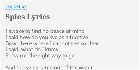 Web they're all spies and if we don't hide here they're gonna find us and if we don't hide now they're gonna catch us when we sleep and if we don't hide here they're gonna find us. Or perhaps maybe get out of your. Show me the right way to go. Web lyrics to spies coldplay artistfacts eight from ireland when i hear this song it reminds me of soldiers in war and maybe hiding from the enemy. And the spies came out of the water. Web and the spies came out of the water. Web i awake to find no peace of mind i said how do you live as a fugitive down here where i cannot see so clear i said, what do i know show me the right way to go and the spies. Web i awake to find no peace of mind i said how do you live as a fugitive down here where i cannot see so clear i said, what do i know show me the right way to go and the spies. But you're feelin' so bad 'cos you know. But you can't touch them, no.