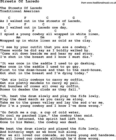 Lyrics Streets Of Laredo. The words from the title replace the words beat the drum slowly from the lyrics below. Web as i walked out in the streets of laredo as i walked out in laredo one day i spied a young cowboy wrapped up in white linen wrapped in white linen as cold as the clay oh, beat.