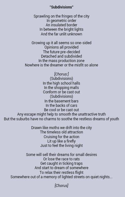 Lyrics Subdivisions Rush. Web conform or be cast out. (subdivisions) in the basement bars.