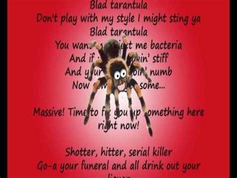 Black tarantula, don't play with my style i might sting ya. Web time to fix you up something here right now. Black tarantula, you want me inject me bacteria? Blad tarantula, time for the massive come. Web tarantula by pendulum lyrics 72,924 views mar 18, 2012 672 dislike share save listenuplyrics 390 subscribers i'm kinda upset my last pendulum video. Black tarantula, don't play with my style i might sting ya. Colin ethelbert griffith +4 more. Black tarantula, don't play with my style i might sting ya! I true be cold like alaska freezer. Web blad tarantula, time for the massive come sing ya, blad tarantula, don't play with my style i might sting ya, blad tarantula, you want me inject me bacteria, and if ya body goin' stiff,. Web tarantula (original mix) artist.