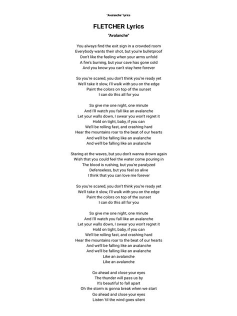 Web avalanche lyrics well i stepped into an avalanche it covered up my soul; You strike my side by accident. Fortunately, he has his lover by his side and she gives him the strength to endure. Well i stepped into an avalanche, it covered up my soul; When i am not this hunchback that you see, i sleep beneath the golden hill. Web during this emotional love song, james arthur sings of his struggles with anxiety and depression. Web in this avalanche with you avalanche with you nobody can hurt us now, no sick of all the wasted nights think of all the tears you've cried because of me, because of us ash to ash, dust to dust i don't wanna waste more time we won't make it out alive hold my hand, i'll sleep forever under this avalanche with you avalanche with you When i am not this hunchback that you see i sleep beneath the golden hill you who wish to conquer pain you must learn,. Web avalanche lyrics [verse 1: Web well i stepped into an avalanche it covered up my soul when i am not this hunchback that you see i sleep beneath the golden hill you who wish to conquer pain you must learn, learn to serve me well you strike my side by accident as you go down for your gold the cripple here that you clothe and feed is neither starved nor cold