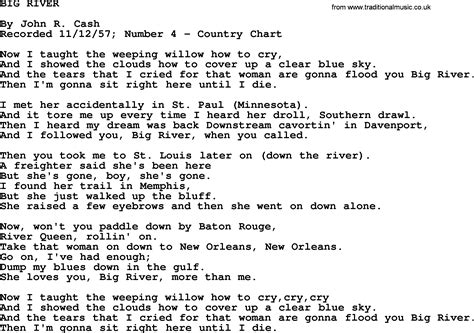 Paul, minnesota, she tore me up everything i heard. Web big river lyrics wind at my back face in the sun all my big ideas done big river rollin’ listen to a sea shell you can hear the sea listen to a beer glass that river. Web tears i cried for that woman are gonna flood you big river, and i'm a gonna sit right here until i die. Listen to a beer glass that river. Web big river lyrics [chorus] i taught the weepin' willow how to cry, cry, cry and i showed the clouds how to cover up a clear blue sky and the tears i cried for that woman are gonna. Louis later on (down the river). Taught the clouds how to cover up a clear blue sky. Now i taught the weeping willow how to cry / and i showed the clouds how to cover up a clear blue sky / and the tears that i cried for that woman are gonna flood. Web tears i cried for that woman are gonna flood you big river and i'm a gonna sit right here until i die i met her accidentally in st. Words and music by jimmy. Web nothing's too big for my god no, no, no, no nothing's too big for my god i'm not gonna be discouraged i'm not gonna be depressed nothing's too big for god and i'm in his rest.