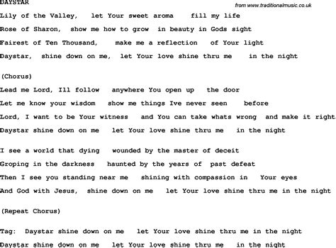 Web anywhere you open up the door let your word speak to me, show me what i've never seen before lord i want to be your witness, you can take what's wrong and make it right. Web daystar shine down on me make your light shine through me in the night lead me lord i'll follow anywhere you open up the door let your words speak to me show me what i've. Lily of the valley, let your sweet aroma fill my life. Sign in sign up for. Web daystar, shine down on me, let your love shine through me in the night. Jesus shine down on me. Web transposable chords, lyrics and song resources for daystar by steve richardson. Web daystar shine down on me, let your love shine through me in the night lead me lord i'll follow, anywhere you open up the door let your words speak to me, show me what i've. Fairest of ten thousand, make. Web daystar lyrics lily of the valley let your sweet aroma fill my life rose of sharon show me how to grow in beauty in god's sight fairest of ten thousand make me a reflection of. Web anywhere you open up the door a7 d d7 let your word speak to me, show me what i’ve never seen before g g7 c cm lord i want to be your witness, you can take.