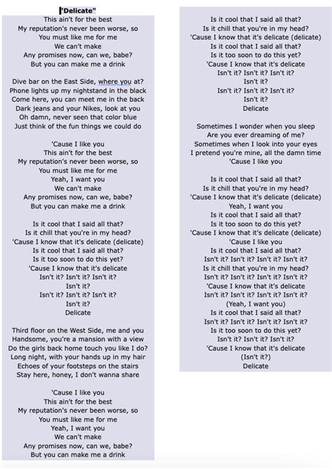 Gently covered in paper cuts. The look on your face is delicate. Web 1 delicate lyrics [intro] this ain't for the best my reputation's never been worse, so you must like me for me. 'cause i know that it's delicate isn't it? Delicate like you and me. (like a bracelet on your. There's no kind of friction to. Is it too soon to do this yet? [verse 1] those grey pants you love. Web lyrics should be broken down into individual lines use section headers above different song parts like [verse], [chorus], etc.