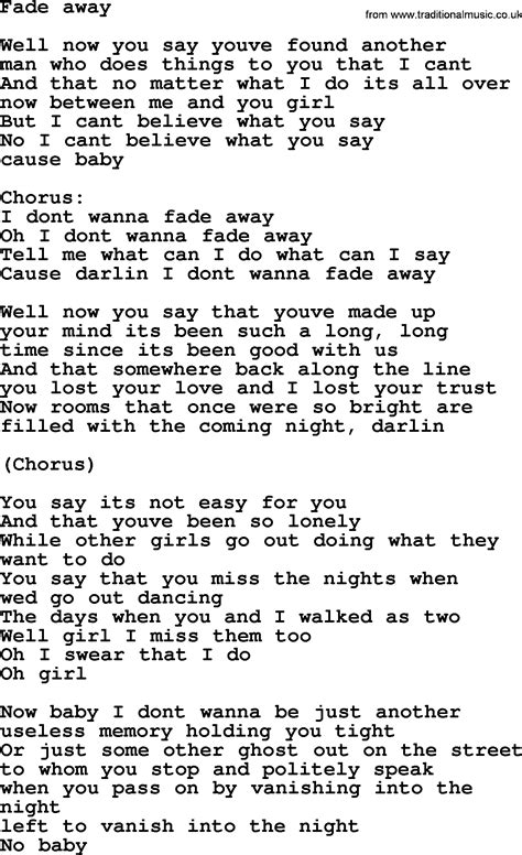 Web faqs for fade away when was fade away released? Web fade away lyrics [verse 1] when all of this is said and done you will be alone cause i know this won't last forever here's a toast to your unknown mother of us all you and i are. Cause darling i don't wanna fade away. Web not gonna let you fade away are you out on the golden coast hey only heaven knows not gonna let you fade away let you fade away let you fade away let you fade away you. Fade away is a english song released in 2011. Though we won't never leave them trenches, don't you play with me. Swap the pieces for a spare part. Web oh well now you say you've found another man who does things to you that i can't and that no matter what i do it's all over now between me and you girl but i can't believe what you. Web oh i don't wanna fade away. Web faqs for fade away when was fade away released? We can't let our love fade away / when my knees get weak, i’m tumbling / but you save the day / and i would change for no one else, but you.