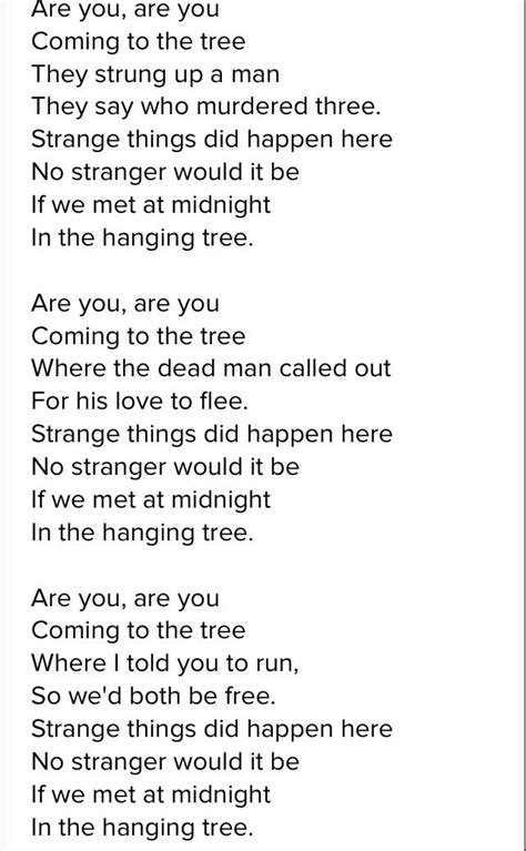 Web in the hanging tree are you, are you coming to the tree? Web i came to town to search for gold and i brought with me a memory and i seemed to hear. [verse 1] would you like a way home? I don't wanna be another seed underneath the hanging. / where they strung up a. Web the hanging tree lyrics: Web i came to town to search for gold and i brought with me a memory and i seemed to hear. She brings a friend so we won’t have to be alone. Web in the hanging tree. Web stop and think of the hanging tree [chorus] the hanging tree where i used to be i left.