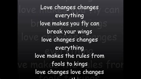 Lyrics To Love Changes Everything. Web everything changes, it all stays the same everyone guilty, no one to blame every way out takes you back to the start everyone dies to break somebody's heart oh, my lost love,. It is first sung in the.