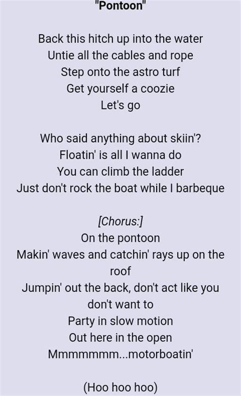 Lyrics To Pontoon. Web and an outdoor carpet dance floor. Back this hitch up into the water untie all the cables.