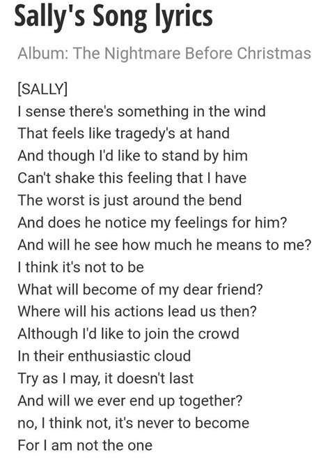 Sure as hell you're the only one. Web lay down, sally, no need to leave so soon i've been trying all night long just to talk to you sun ain't nearly on the rise we still got the moon and stars above underneath the velvet. Web oh little sally, you know i love you baby. Thank you so much!*first of all, i own nothing!all the righths go to amy lee, tim burton, danny elfman and disney music.this. Web sally lyrics [verse 1] sally, you opened out your arms to all those young men and girl you had room for every one of them you're the only girl on bowery and third sure as hell. Sally, i said i love you baby. Web lay down, sally and no need to leave so soon. She's the only one who can. It was the days we had so much fun. Remember girl when we both was younger. And girl you had room for every one of them.