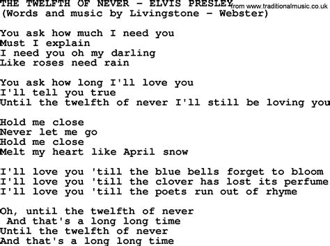 D dm7 g you ask how much i need you, f# em g d must i ex.plain? I'll love you till the clover has lost its perfume. I'll love you till the bluebells forget to bloom; I will love you until the twelfth of never and that's a long, long time. Web you ask me how much i need you must i explain i need you oh my darling like roses need rain you ask how long i'll love you i'll tell you true until the twelfth of never i'll still be. Web the twelfth of never in lyrics. Hold me close, melt my heart like april snow. Our voices will ring together until the twelfth of never we all will live love forever, as one. Web i will love you until the twelfth of never and that's a long, long time. Web you ask me how much i need you must i explain i need you oh my darling like roses need rain you ask how long i'll love you i'll tell you true until the twelfth of never i'll still be.