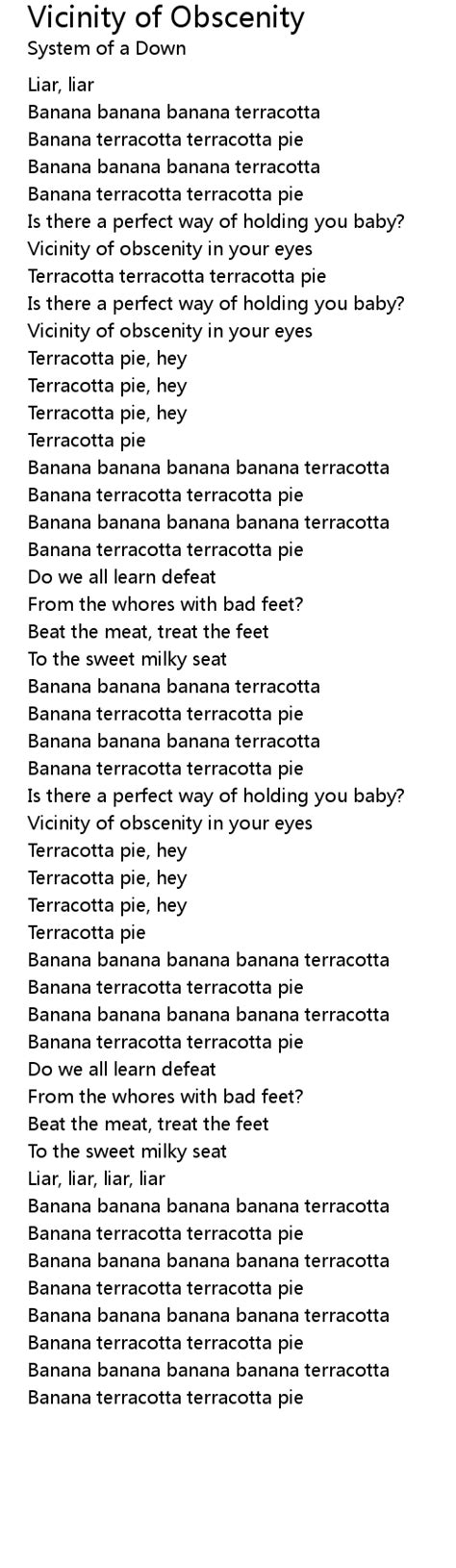 Web vicinity of obscenity in your eyes terracotta terracotta terracotta pie is there a perfect way of holding you baby? Web vicinity of obscenity in your eyes terracotta pie, hey terracotta pie, hey terracotta pie, hey terracotta pie banana, banana, banana, banana, terracotta banana terracotta,. Web vicinity of obscenity in your eyes terracotta terracotta terracotta pie is there a perfect way of holding you baby? Terracotta pie refers to a vag and banana. Web vicinity of obscenity in your eyes terracotta pie hey terracotta pie hey terracotta pie hey terracotta pie hey banana banana banana banana terracotta banana terracotta. Web vicinity of obscenity in your eyes terracotta terracotta terracotta pie is there a perfect way of holding you baby? Web (liar) vicinity of obscenity in your eyes terracotta pie, hey terracotta pie, hey terracotta pie, hey terracotta pie banana, banana, banana, banana, terracotta. Is there a perfect way of holding you baby?! Web vicinity of obscenity in your eyes! Web the lyrics for vicinity of obscenity by system of a down have been translated into 16 languages liar liar banana banana banana terracotta banana terracotta. (liar) vicinity of obscenity in your eyes!