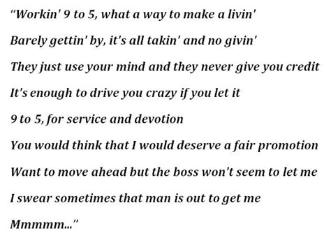 Lyrics Working Nine To Five. Web workin' 9 to 5, what a way to make a livin' barely gettin' by, it's all takin' and no givin' they just use your mind and you never get the credit it's enough to drive you crazy if you let it 9. Stuck in the office from nine until five life is so.