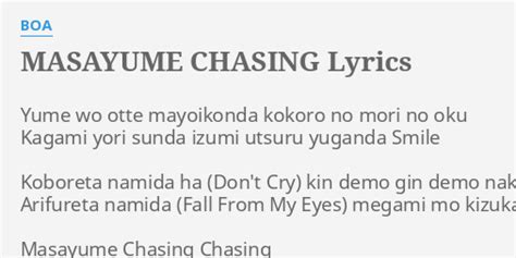 Masayume Chasing Lyrics. 夢を大手迷い込んだ 心の森の置く 鏡より住んだ泉 移るゆがんだsmile こぼれた涙は(don't cry) 金でも銀でもなくて ありふれた. Yume wo otte mayoikonda kokoro no mori no oku kagami yori sunda izumi utsuru yuganda smile.