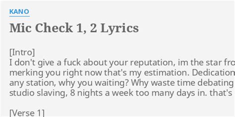 Mic Check 1 2 Lyrics. Hey yo, ill, you set it. Kano] i couldn't give a fuck about your reputation i'm the star from the top like christmas decorations and me merking you right.