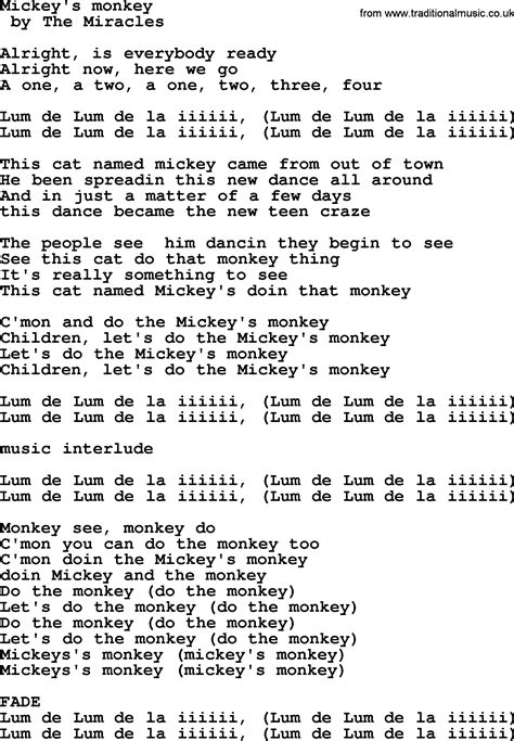 Mickey's Monkey Lyrics. Web monkey see, monkey do c'mon you can do the monkey too c'mon doin the mickey's monkey doin mickey and the monkey do the monkey (do the monkey) let's do the. Web mickey's monkey alright, is everybody ready alright now, here we go a one, a two, a one, two, three, four lum de lum de la iiiiii, (lum de lum de la iiiiii,) lum de lum de la iiiiii,.