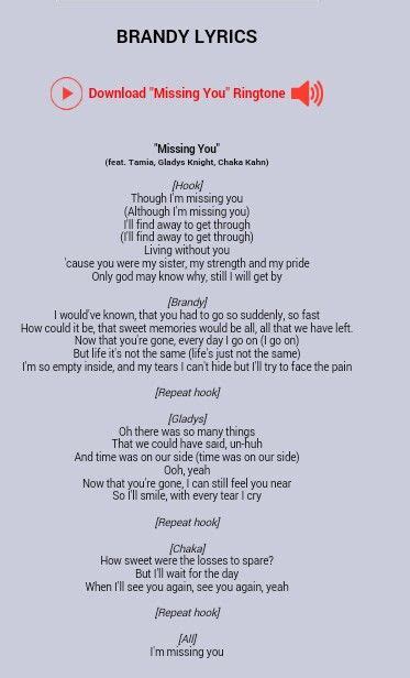 Barry j eastmond, gordon chambers. Web listen to missing you on spotify. Brandy · song · 1996. Web though i'm missing you (although i'm missing you) i'll find a way to get through (i'll find a way to get through) living without you 'cause you were my sister, my strength, and my. (i'll find a way to get through) living without you. (although i'm missing you) i'll find a way to get through. Though i'm missing you(although i'm missing. (although i'm missing you) i'll find a way to get through. Web the lyrics for missing you by brandy, tamia, gladys knight & chaka khan have been translated into 1 languages. 'cause you were my sister, my strength and my.