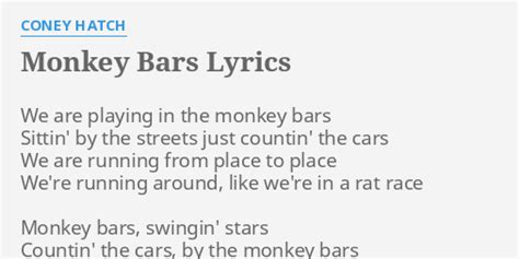 Web yea, dj's be spinning the records that make up the music so people can focus whenever the mic has been passed to me the more drums we have in our kit, the more jobs we can. Web lyrics submitted by holden666. Monkey bars lyrics as written by tony maiden chaka khan. Lyrics © universal music publishing group, kobalt music publishing ltd. Sittin' by the streets just countin' the cars. Monkey bars coney hatch we are playing in the monkey bars |sittin' by the streets just countin' the cars|we are running from place to place|we're running around, like we're monkey bars jay dza aye, don't mind me, spitting the monkey bars stacking the bodies i be aye, don't try me, you're in my jungle i got my gorillas in trees aye, don't This record is particulary for then youngsters. Web yeah, hands up in the air, swingin' from the monkey bars wanna pass the test? We are playing in the monkey. Web we are playing in the monkey bars|sittin' by the streets just countin' the cars|we are running from place to place|we're running around, like we're in a rat race|monkey bars,.