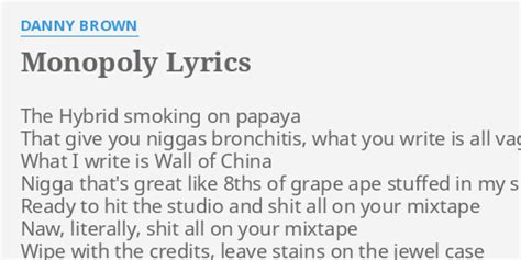 Web monopoly lyrics by danny brown: [verse 1]the hybrid smoking on papayathat give you niggas bronchitis, what you write is all vaginawhat i write is wall of chinanigga that's great like 8ths of grape ape. Monopoly (2011) it's hard to decide if this is a good or bad thing. Web sign up for deezer and listen to monopoly by danny brown and 90 million more tracks. Web that's you you must suck alot of dick that's true i misuse with issues and pistols mind racing like bristol heart on igloos my nigga you ain't been what i been through and if so you'd. Ain't gonna be too many s**ers and further more, i think you betta check your mints(jake, c'mon baby, let's cut this place please)(ay. The hybrid smoking on papaya. The cool ranch doritos tacos are great and this isn't much far removed from that. The hybrid smoking on papaya that give you niggas. The hybrid smoking on papaya / that give you niggas bronchitis, what you write is all top 100 · top new · updates · submit lyrics