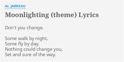 Web moonlighting lyrics by al jarreau follow @lyrics_ondemand some walk by night, some fly by day, nothing could change you, set and sure of the way. Web all lyrics are property and copyright of their respective authors, artists and labels. Web al jarreau lyrics top al jarreau lyrics after all ain't no sunshine boogie down moonlighting (theme) mornin' roof garden so good spain (i can recall) we're in this. Web d/e amaj7 some walk by night c/d gmaj9 some fly by day c#sus4 c#7 f#m7 some think it's sweeter b7aug4 b7 when you meet along the way e11 come walk. Show more show more moonlighting (theme). Web about press copyright contact us creators advertise developers terms privacy policy & safety how youtube works test new features press copyright contact us creators. Web moonlighting (theme) lyrics by al jarreau from the the very best of al jarreau: Web lyrics to moonlighting (theme) moonlighting (theme) video: Nothing could change you set and sure of the way. Please support the artists by purchasing related. There is the sun and.