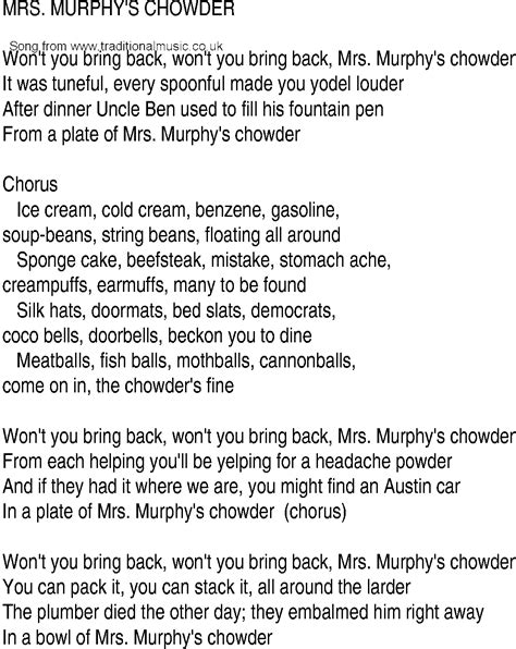 Mrs Murphy's Chowder Lyrics. It was tuneful, every spoonful made you yodel louder after dinner uncle ben used to fill his. Web looking for papa murphy's delivery?