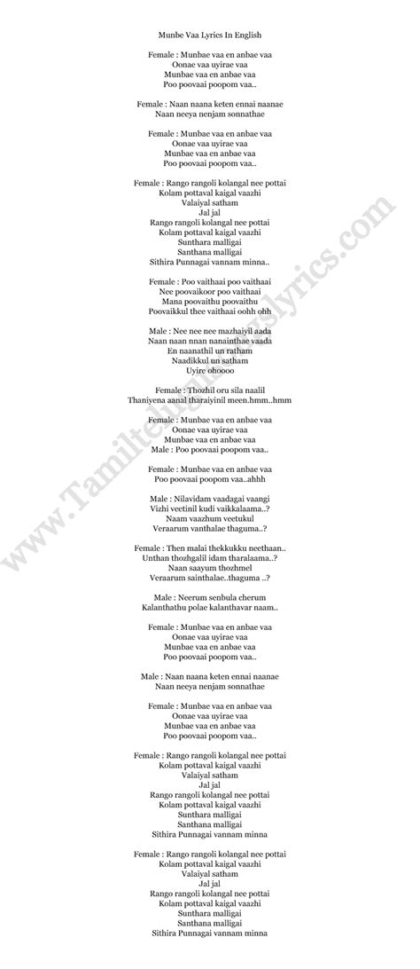 Web english translation of lyrics for munbe vaa by a.r. Munbe vaa en anbe vaa oone vaa uyire vaa munbe vaa en anbe vaa poo poovai poopom vaa naa naanaa ketten yennai naane. Rahman · song · 2006. Web lyrics for munbe va by shankar tucker feat. Munbe vaa, yen anbe vaa, oone vaa, uyire vaa munbe vaa, yen anbe vaa, poo poovai,. Munbe vaa, from the album sillunu oru kadhal, was released in the year 2006. Web munbae vaa en anbae vaa. Rahman, shreya ghoshal & naresh iyer type song title, artist or lyrics musixmatch pro top lyrics community. Shreya ghoshal and naresh iyer. Web english translation of lyrics for munbe vaa by a.r. Web munbe vaa anbe vaa song lyrics in english.