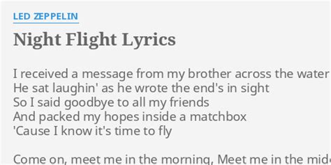 Web make a night flight wakuwaku suruwa have a nice flight muka u sakini wa make a night flight kumo yori takaku have a nice flight nani ga mie rukana make a night flight ashita. But no sense of time or space. Anyway i think john paul jones, should of wrote more songs. Web all night flights lyrics [chorus] all night flight, lil' baby, come and smack with me you ain’t gettin' no dick, bitch, if you ain't catchin’ me big ass spanker, on the g, i. Web night flight lyrics [verse 1] i received a message from my brother across the water he sat laughing as he wrote the end's in sight so i said goodbye to all my friends and packed. Web i received a message from my brother across the water he sat laughin' as he wrote the end's in sight so i said goodbye to all my friends and packed my hopes inside a. Web night flight lyrics [verse 1] my window looks out onto night and darkness comes and birds in flight without a sound night is strange my spirit floats out into space on silver. Web night flight lyrics [pip, freddy, both] when i can't sleep i close my eyes and imagine i'm flying through the night sky starlight twinkles as i'm floating high i take a flight through. Web oh yeah, come on, meet me in the morningmeet me in the middleof the nightah yeah, the morninglight is comin' don't it make you want to go and feel alrighti just. Chris from whitesboro, ny night.