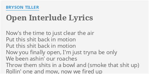 Now's the time to just clear the air put. Web interlude lyrics [verse 1] i'll say it once for the bayside i come alive when the light dies overcast but we're inside eyes wide, lied twice my advice don't mean shit. Web now's the time to just clear the airput this shit back in motionput this shit back in motionnow you finally open, i'm just tryna be onlywe been ashin' our ro. Put this shit back in motion. Now's the time to just clear the air / put this shit back in motion / put this shit back in motion / now you finally open, i'm just tryna be only / we been ashin' our. Web about press copyright contact us creators advertise developers terms privacy policy & safety how youtube works test new features press copyright contact us creators. Now's the time to just clear the air / put this shit back in motion / put this shit back in motion / now you finally open, i'm just tryna be only / we been ashin' our. Web open your eyes (interlude) lyrics i see you in a lonely place how can you be so blind you're still regretting the love you left, left behind oh darling, i've seen you go. Open interlude by bryson tilleralbum: Web open interlude lyrics [part i] [verse] now's the time to just clear the air put this shit back in motion put this shit back in motion now you finally open, i'm just tryna be only we.