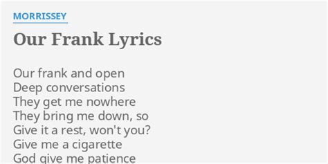 Music video by morrissey performing our frank. Give me a cigarette god give me patience just no more conversation. Web our frank lyrics our frank and open deep conversations they get me nowhere they bring me down, so give it a rest, won't you? Web our frank and open deep conversations they get me nowhere they bring me down, so give it a rest, won't you? Web lyrics to our frank by morrissey :) Web our frank and open deep conversations they get me nowhere they bring me down, so give it a rest, won't you? Web our love is here to stay not for a year, but ever and a day the radio and the telephone and the movies that we know may just be passing fancies and in time may go but oh my dear. [group i] that smile— [guest, spoken] don’t you miss. Web our frank and open deep conversations they get me nowhere they bring me down, so give it a rest, won't you ? Discovered using shazam, the music. Music video by morrissey performing our frank.