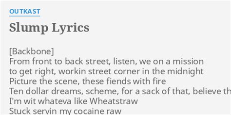 Web slump lyrics outkast aquemini lyrics to slump slump video: Backbone, cool breeze) [backbone] from front to back street, listen, we on a mission. Web they get in a slump like baseball players when they short on they rent anything goin', you ain't knowin' how much money you spent but in the real world you surrounded by these ladies and gents who hang around you 'cause you be buyin' all the weed and all the chicken feedin' everybody, smokin' 'em out when you was broke though they was missin' Backbone, cool breeze) [backbone] from front to back street, listen, we on a mission to get right, workin street corner in the midnight picture the scene, these fiends with fire ten dollar dreams, scheme, for a sack of that, believe that i'm wit whateva like wheatstraw stuck servin my cocaine raw {backbone}from front to back street, listen, we on a missionto get right, workin street corner in the midnightpicture the scene, these feinds w/fire10 $ dreams, scheme, for a sack of that, believe thatim with whateva like wheatstrawstuck servin my cocaine rawstop 62 off the. I'm wit whateva like wheatstraw. Picture the scene, these fiends with fire. Picture the scene, these fiends with fire. I'm wit whateva like wheatstraw. One of the few tracks that doesn’t have andre on it,. Ten dollar dreams, scheme, for a sack of that, believe that.