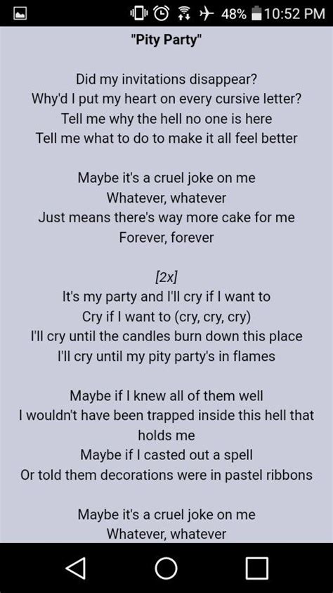 Pity Party Lyrics. Web pity party lyrics [verse 1] did my invitations disappear? Web tell me why the hell no one is here tell me what to do to make it all feel better maybe it's a cruel joke on me whatever, whatever just means there's way more cake for me forever, forever it's my party and i'll cry if i want to cry if i want to (cry, cry, cry) i'll cry until the candles burn down this place i'll cry until my pity party's in.